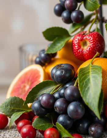A vibrant collection of fresh fruits features strawberries, cherries, grapes, oranges, and blueberries on a display. Perfect for a summer gathering or a health focused event.