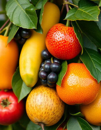 An abundant assortment of fresh, exotic fruits fills the scene, showing a vibrant blend of colors. The collection includes pineapples, grapes, oranges, and various berries, all intricately arranged against a lively backdrop of nature. This visually captivating display highlights the beauty of organic produce.
