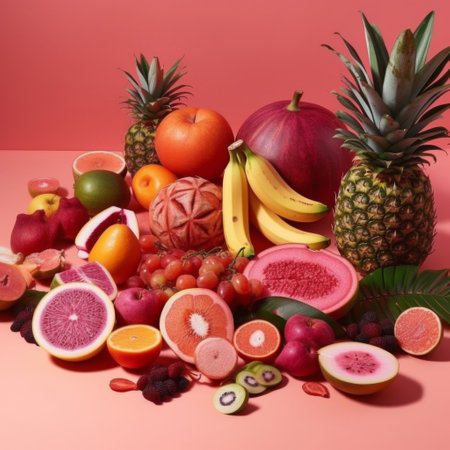 An abundant assortment of fresh, exotic fruits fills the scene, showing a vibrant blend of colors. The collection includes pineapples, grapes, oranges, and various berries, all intricately arranged against a lively backdrop of nature. This visually captivating display highlights the beauty of organic produce.