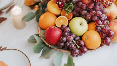 A vibrant display of fresh fruits in a decorative bowl on a table with soft candlelight in the background