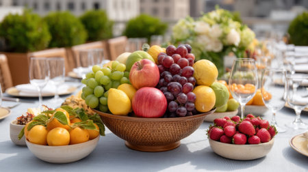 A beautifully arranged rooftop dining table showcasing a vibrant assortment of fresh fruits and wine glasses, perfect for summer gatherings with a stunning city skyline view.