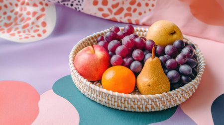 A beautifully arranged basket of fresh fruits including apples, grapes, oranges, and pears on a vibrant abstract background, showcasing healthy eating and vibrant colors.