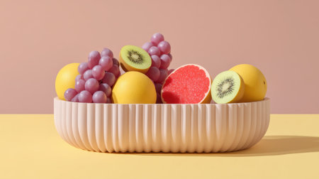 A vibrant display of assorted fresh fruits arranged beautifully in a modern bowl on a pastel background, ideal for healthy lifestyle promotion and culinary inspiration.