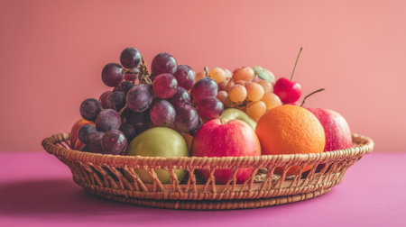 A delightful arrangement of various fruits in a woven basket, set against a soft pink background, showcasing the beauty of fresh produce in a vibrant composition.