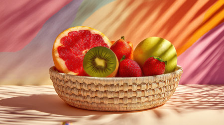 A vibrant arrangement of fresh fruits in a woven basket highlighting grapefruit, kiwi, apples, and strawberries on a colorful background with intriguing shadows.