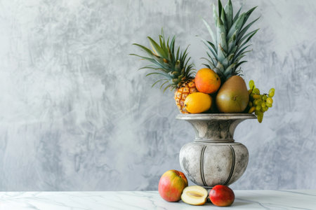 A beautifully crafted antique vase displays an array of colorful fruits, including pineapples, mangoes, and apples, set against a textured gray background that enhances their freshness and vibrancy.