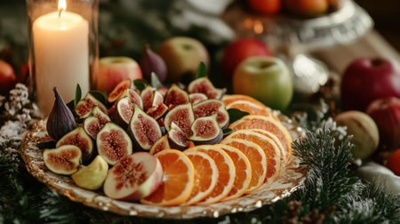 A beautifully arranged platter featuring fresh figs, oranges, and apples. Perfect for autumn gatherings or festive celebrations, complemented by candlelight.