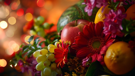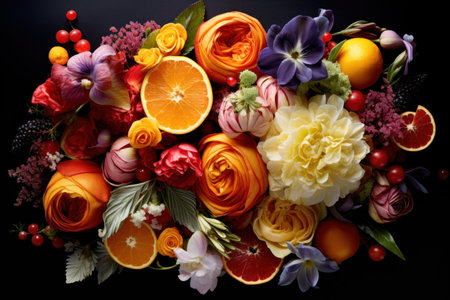 Vibrant floral and citrus display with fresh berries on dark background. That the image is generated using AI.