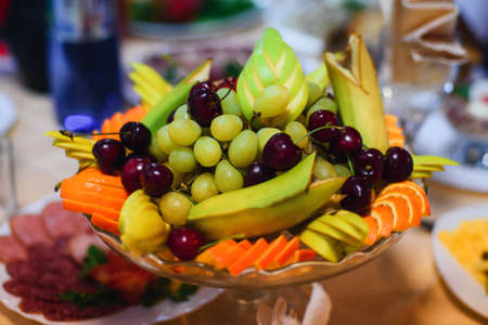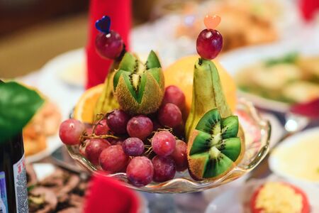 Plate with different fruits on the festive table horizontal