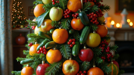 Unique Christmas tree crafted from a variety of colorful fruits and vegetables, bringing a fresh and healthy twist to traditional holiday decorations. Ideal for health-conscious holiday themes