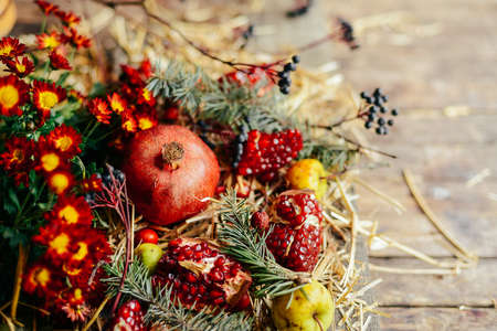 Christmas background with Garnet, berries, fruit and cones, selective focus. Basket of fruits on wooden background. Healthy eating and dieting concept. Winter assortment. Copy space. Top view