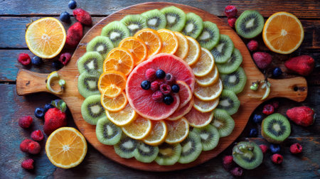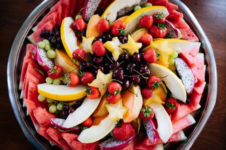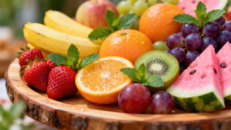 Colorful fruit platter on wooden table