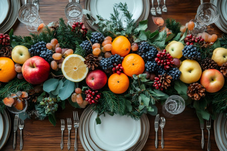 Festive Christmas table setting with centerpiece made of fir branches, fruits and pine cones decorating a dining table