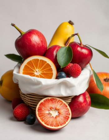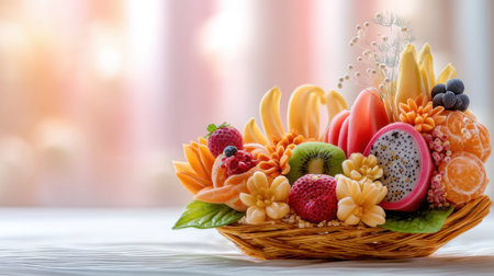 A stunning arrangement of fresh fruits in a decorative basket, showcasing a variety of colors and textures, perfect for summer gatherings or healthy lifestyle choices.