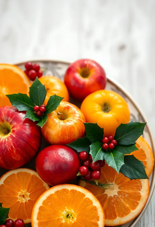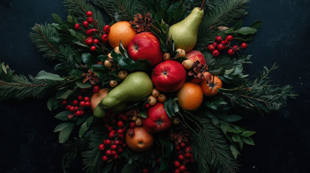 A vibrant arrangement of fresh fruits and greenery, featuring apples, pears, oranges, and berries, set against a dark surface for a striking visual. Perfect for seasonal decorations.