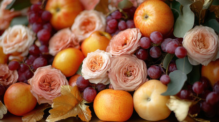 Vibrant Autumn Arrangement with Fresh Fruits, Pale Pink Roses, and Golden Leaves for Seasonal Decor.