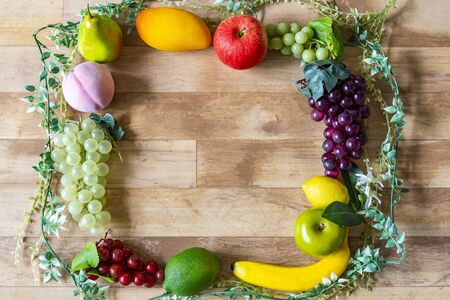 Variety of fresh assorted fruits on the old wooden table. Assorted fruits colorful background, healthy fruits, Selective focus.