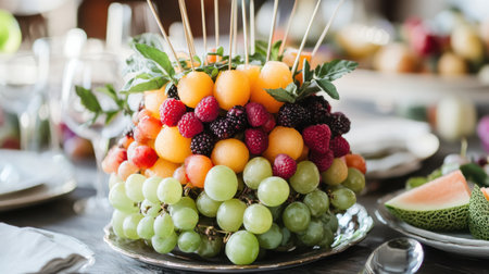 This fruit centerpiece showcases an artistic arrangement of skewered berries, melon balls, and grapes, creating a vibrant display perfect for a spring gathering. Ideal for celebrations.