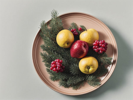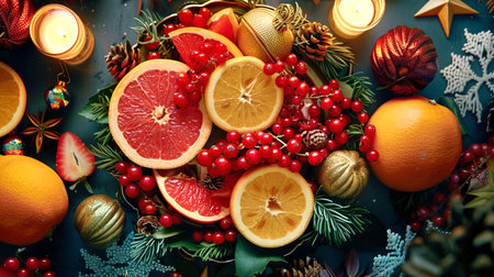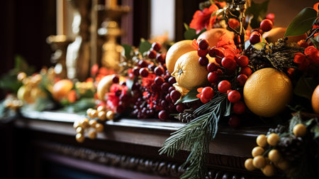 bouquet of fresh fruits and red pomegranate with coniferous branches