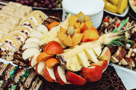 Fresh fruits, grapes, apples and pears on a fruit plate prepared for guests and participants of the event. Catering. Vitamins and proper nutrition. Vegetarian diet.