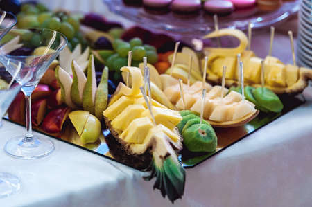 Fruit bar. Table with fruits, bananas, grapes. orange and pineapple. Beautiful table setting, fruit on stands, selective focus
