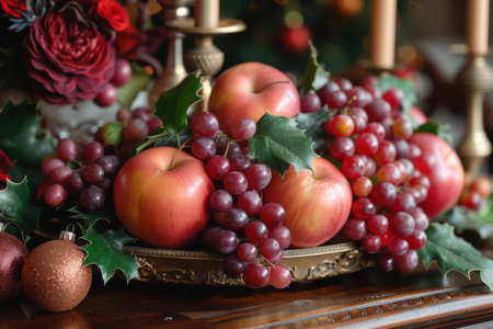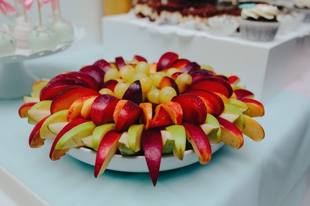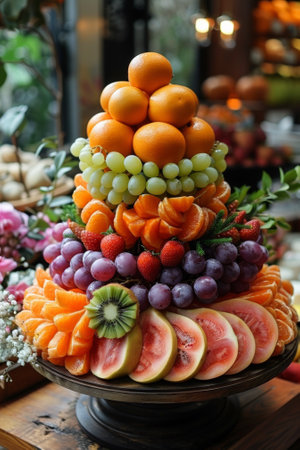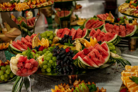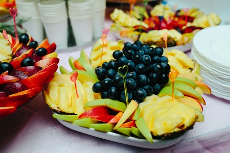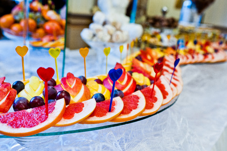 Wedding reception of fruits, decorated grapefruit apple and grape