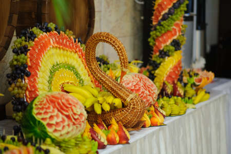 Carved fruits arrangement. Fresh various fruits. Assortment of exotic fruits. Fresh fruits decoration