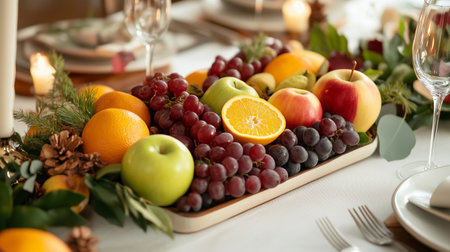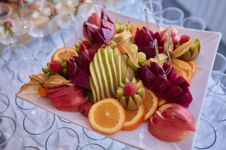 Fruit platter with apple slices, orange, grapes, watermelon, strawberries and mint on festive table, symbolizing catering, healthy eating, holiday meals and celebrating dining