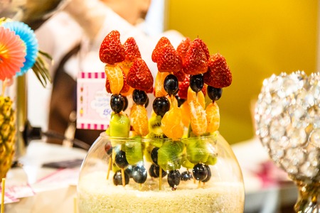 Close-up of fresh sliced fruits and berries with bamboo skewers. Assorted strawberries, pineapples, blueberries and oranges dusted with powdered sugar for a buffet