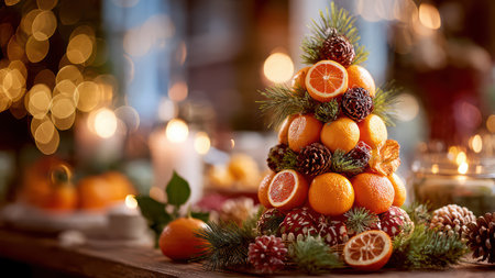Tangerines in Christmas decor with Christmas tree, nuts and apples on light wooden background