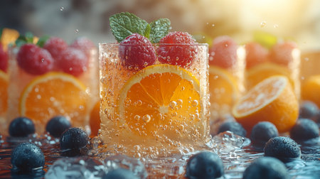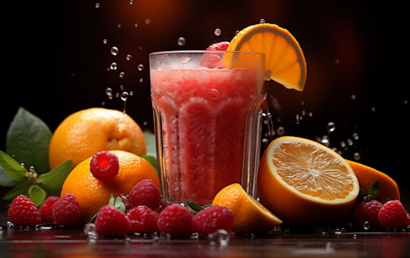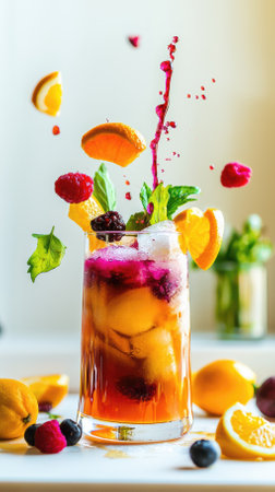 A refreshing fruit cocktail with orange slices and raspberries splashing dynamically in a glass, captured with vibrant colors and energy.