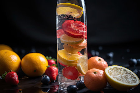 close-up of water bottle with multiple fruit slices floating in it, created with generative ai
