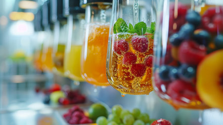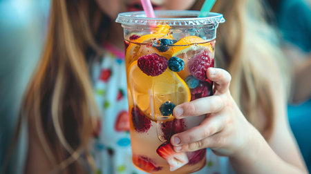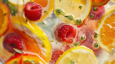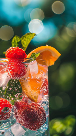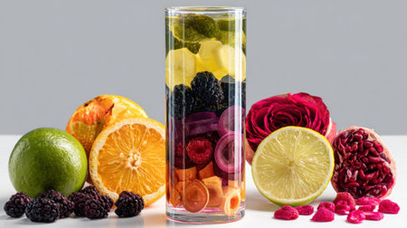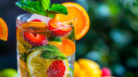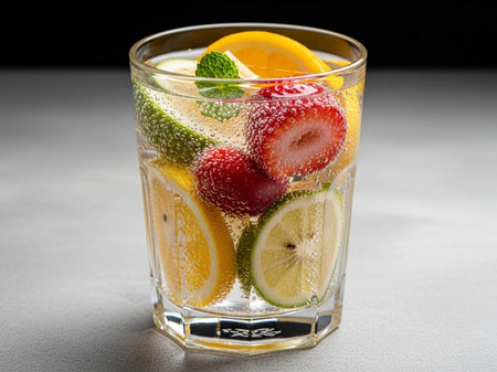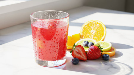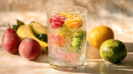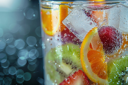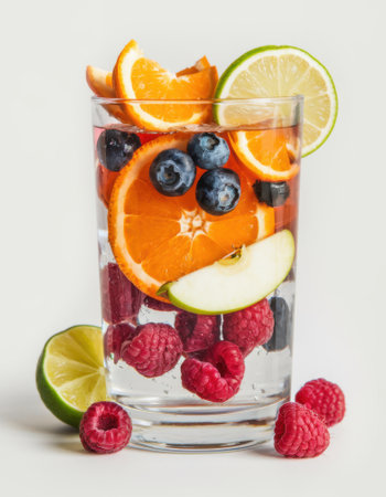 A refreshing glass filled with a mix of colorful fruits and sparkling water, showcasing vibrant colors in a bright and inviting setting. Perfect for summer.