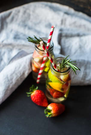 Organic fruit detox drink with lime, strawberry and rosemary herb on rustic background