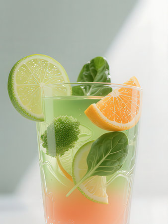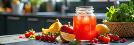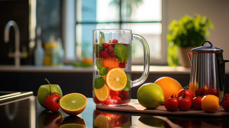 Refreshing summer beverage with fresh fruits and ice in a sunlit kitchen. That the image is generated using AI.