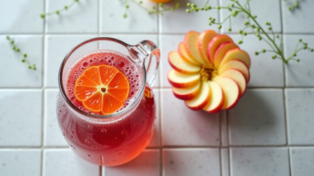 Refreshing citrus punch in glass pitcher with sliced apple garnish on tiled surface. That the image is generated using AI.