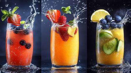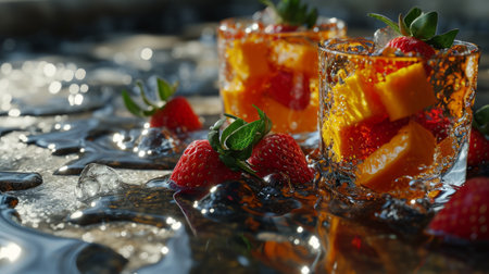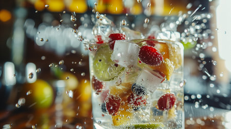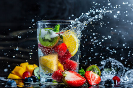 A refreshing glass filled with various chopped fruits like mango and strawberry sits in sparkling water. Bubbles and splashes create a vibrant scene amongst a dark backdrop.