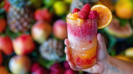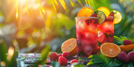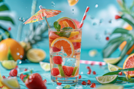 A colorful cocktail brimming with fresh fruits like raspberries, oranges, and limes, garnished with mint and an umbrella, set against a lively tropical backdrop, perfect for summer enjoyment.