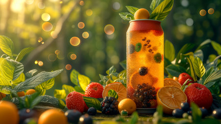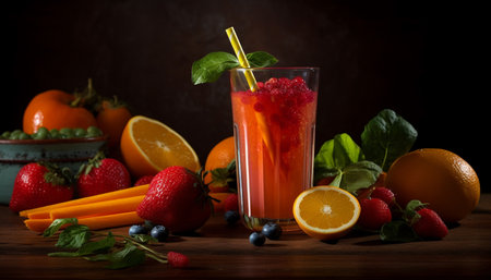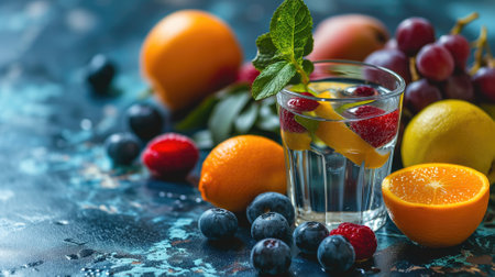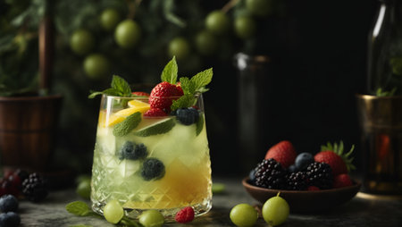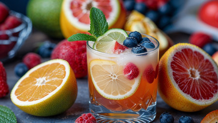 Vibrant cocktail filled with citrus, berries, and mint sits amidst a colorful assortment of fresh fruit. Ai generated image