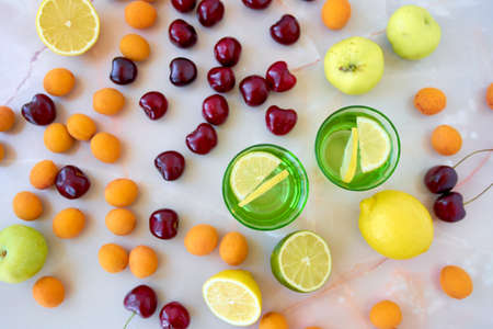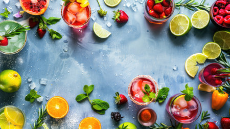 Summer refreshing drinks, fruit and berry mojito or lemonade with fresh mint, frozen berries, slices of lemon and orange, ice, on a light blue background. copy space top view