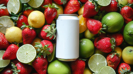 A white aluminum can sits nestled amongst a bed of ripe, juicy strawberries, limes, and lemons. The vibrant colors of the fruit create a striking contrast against the simple white of the can, suggesting a cool and refreshing drink perfect for a hot summer day.