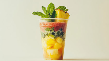 This vibrant tropical smoothie features fresh fruits layered in a clear cup, garnished with mint and pineapple, perfect for a refreshing summer treat.
