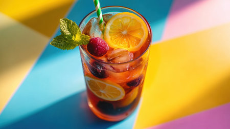 A glass of fruit iced tea with ice cubes, citrus, and berry garnishes, set against a playful and vivid color backdrop.