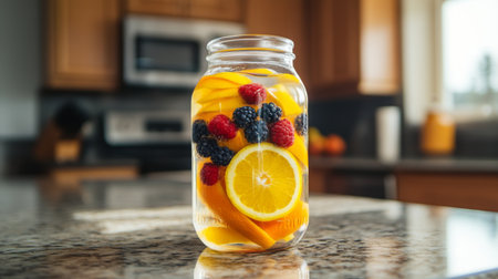 A clear jar filled with vibrant fruit slices, including raspberries, blackberries, and citrus, placed on a kitchen countertop, creating a refreshing beverage.