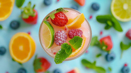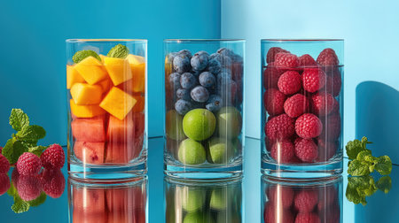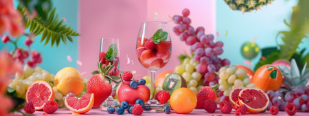 A colorful arrangement of fresh fruits and glasses filled with berries and mint leaves, set against a pastel background. The image is lively and fresh, ideal for food, beverage, and summer themes.