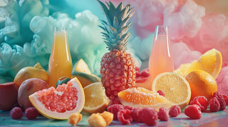 A vibrant scene featuring a colorful fruit cocktail surrounded by fresh tropical ingredients. Perfect for summer vibes and healthy parties.