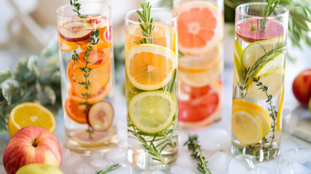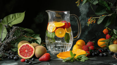A closeup of a pitcher containing a delicious and hydrating fruitinfused water surrounded by slices of fruit and floating herbs