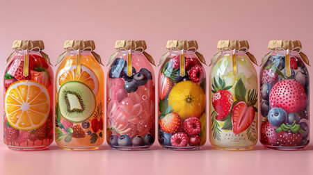 Four bottles filled with fruity beverages stand proudly amidst a colorful assortment of raspberries, oranges, and fresh mint leaves, creating a lively and refreshing atmosphere.