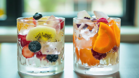 Two glasses with fresh cut fruits and ice, bathed in soft sunlight, indoors.