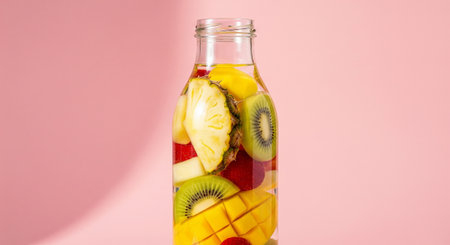 Bottle of fruit infused water on pink background. Refreshing summer drink.
